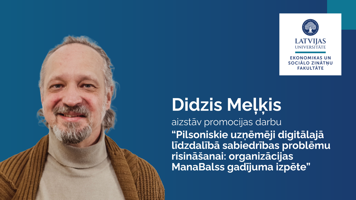 LU Ekonomikas un sociālo zinātņu fakultātē (ESZF) Didzis Meļķis aizstāvēja promocijas darbu „Pilsoniskie uzņēmēji digitālajā līdzdalībā sabiedrības problēmu risināšanai: organizācijas “Mana Balss” gadījuma izpēte” zinātniskā doktora grāda (Ph. D.) sociālajās zinātnēs iegūšanai zinātnes nozarē „Politikas zinātne”.